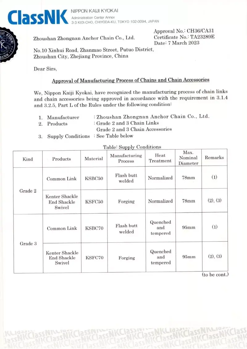 हम बड़े अपतटीय प्लेटफार्मों के साथ -साथ मध्यम आकार के जहाजों की आवश्यकताओं को पूरा करते हुए, 34 मिमी से 142 मिमी तक के व्यास के साथ अपतटीय मूरिंग श्रृंखलाओं का निर्माण करते हैं। सख्त POOF लोड परीक्षण हर श्रृंखला पर किया जाता है, और अंतरराष्ट्रीय मानक को पूरा करने के लिए संबंधित ब्रेकिंग लोड मूल्यों की पुष्टि की जाती है। एक विस्तृत परीक्षण लोड तालिका नीचे दिखाया गया है।