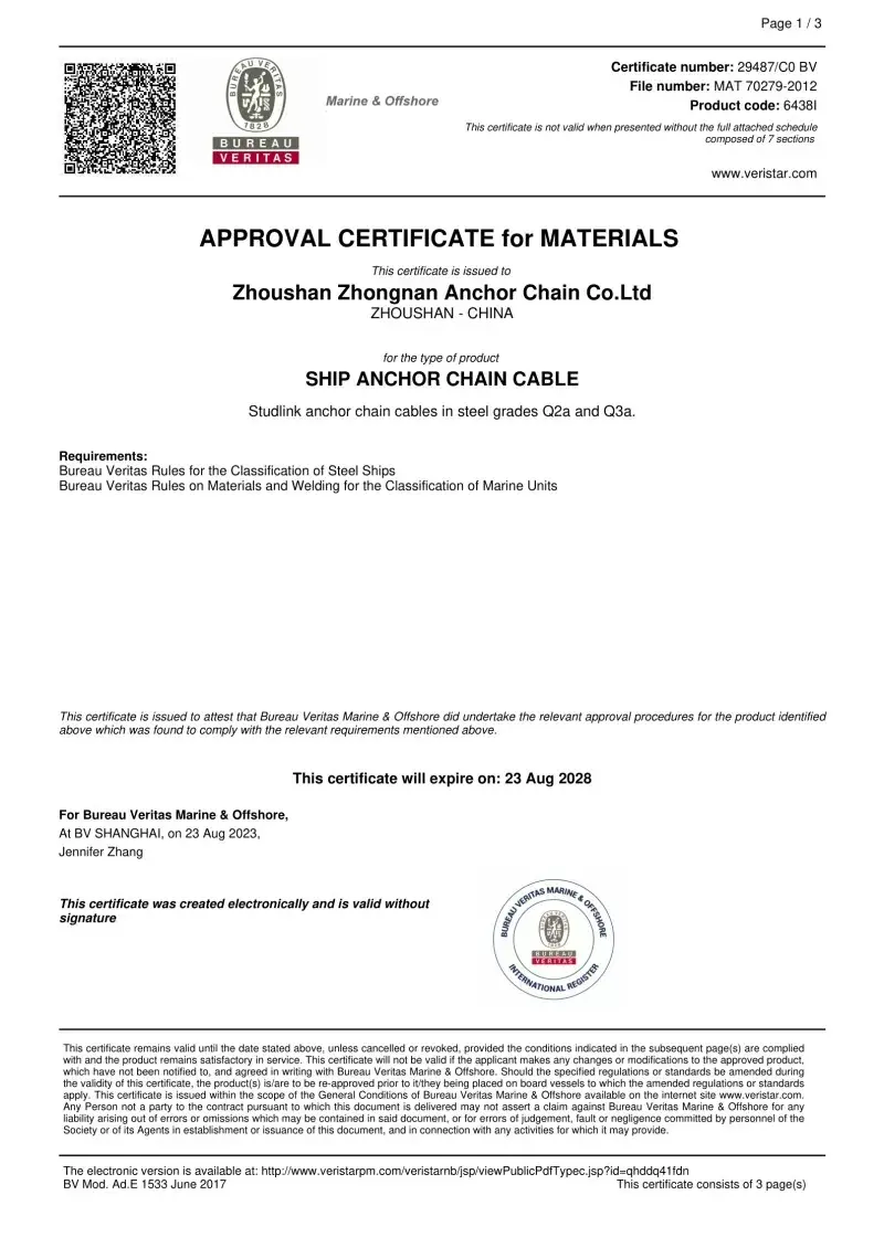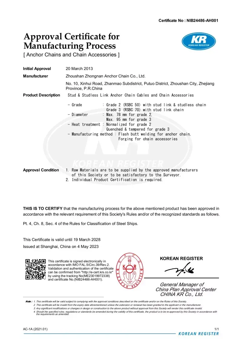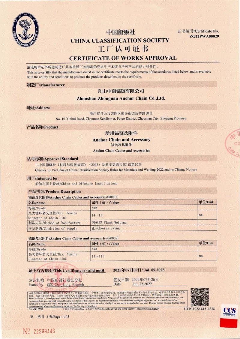 हाँ। हमारे कारखाने में उत्पादित प्रत्येक श्रृंखला सीसीएस, एबीएस, डीएनवी, बीवी, एलआर, एनके, रीना, केआर, और आरएस जैसे प्रमुख अंतर्राष्ट्रीय वर्गीकरण समाजों से प्रमाणन के साथ आती है। ये प्रमाण पत्र IACS और ISO मानकों और इसके प्रूफ लोड और ब्रेकिंग लोड विनिर्देशों के लिए चेन के पालन के लिए हैं।