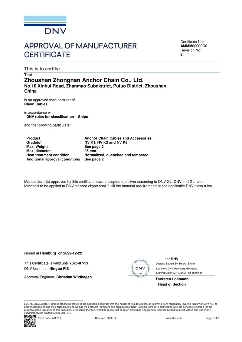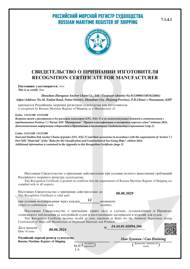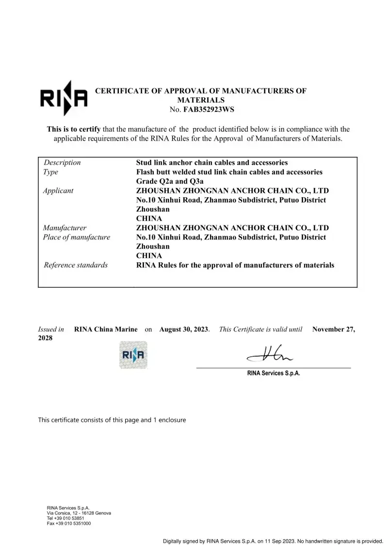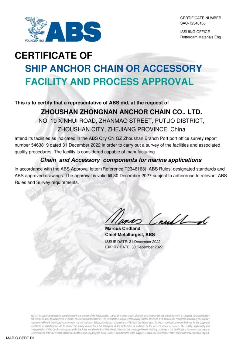 हाँ। हमारे कारखाने में उत्पादित प्रत्येक श्रृंखला सीसीएस, एबीएस, डीएनवी, बीवी, एलआर, एनके, रीना, केआर, और आरएस जैसे प्रमुख अंतर्राष्ट्रीय वर्गीकरण समाजों से प्रमाणन के साथ आती है। ये प्रमाण पत्र IACS और ISO मानकों और इसके प्रूफ लोड और ब्रेकिंग लोड विनिर्देशों के लिए चेन के पालन के लिए हैं।